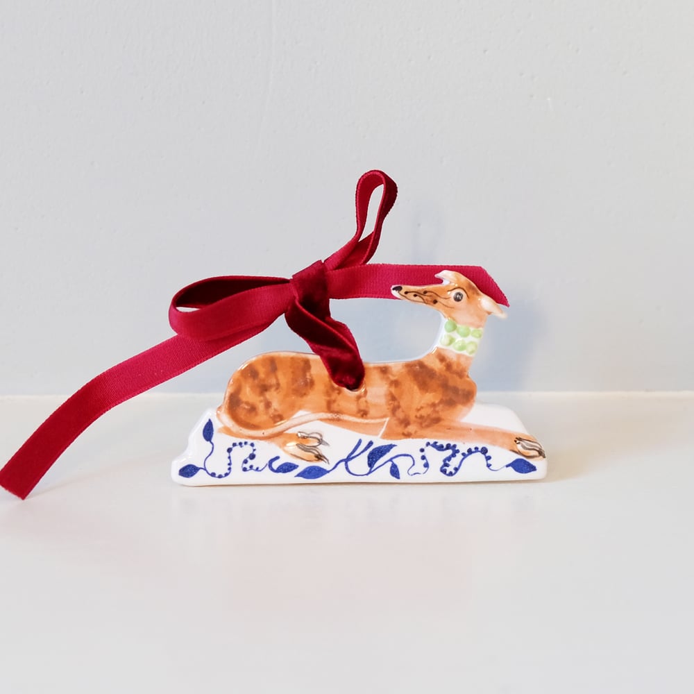 Hanging Ornament - Tan Brindle Sighthound with blue leaves